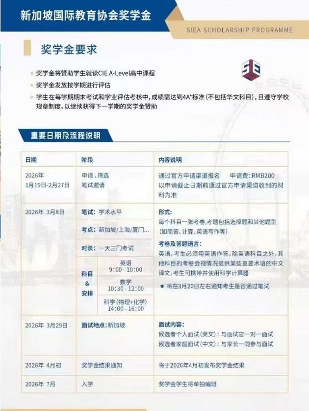 · 一等奖学金(30 个名额):全额覆盖 A-Level 课程学费 + 校内住宿费(约 7 万新币 / 年,折合人民币 40 万 / 年),额外提供一次性入学安置费。